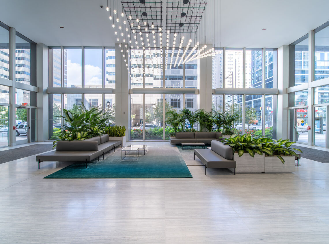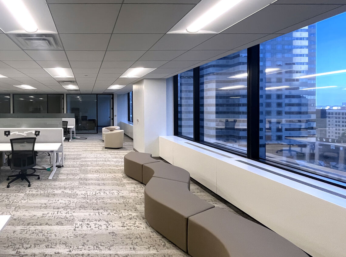 In addition to the lobby, Clemens completed interior fit-outs of the 7th, 8th, and 9th floors of the building. These spec suites were transformed with new flooring, glass partitions, ceiling tiles, casework, paint, and lighting, creating bright and modern office environments. Each floor was fully furnished and designed to appeal to prospective tenants, with upgraded finishes throughout. Additional improvements were made to the existing elevator lobbies, corridors, and restrooms, enhancing the overall quality and cohesion of the building’s interior spaces.