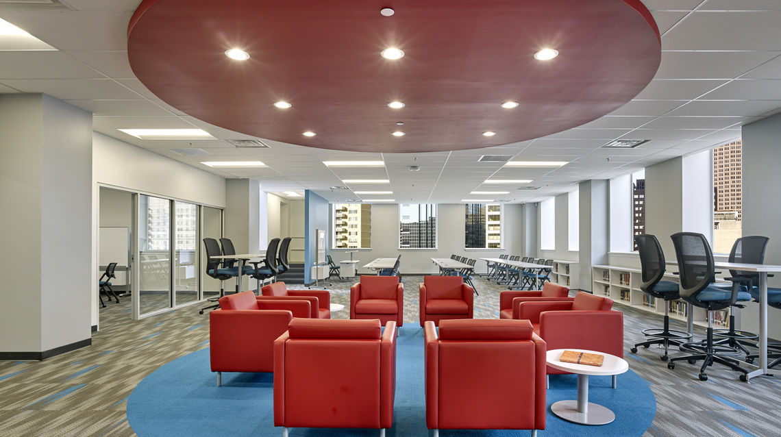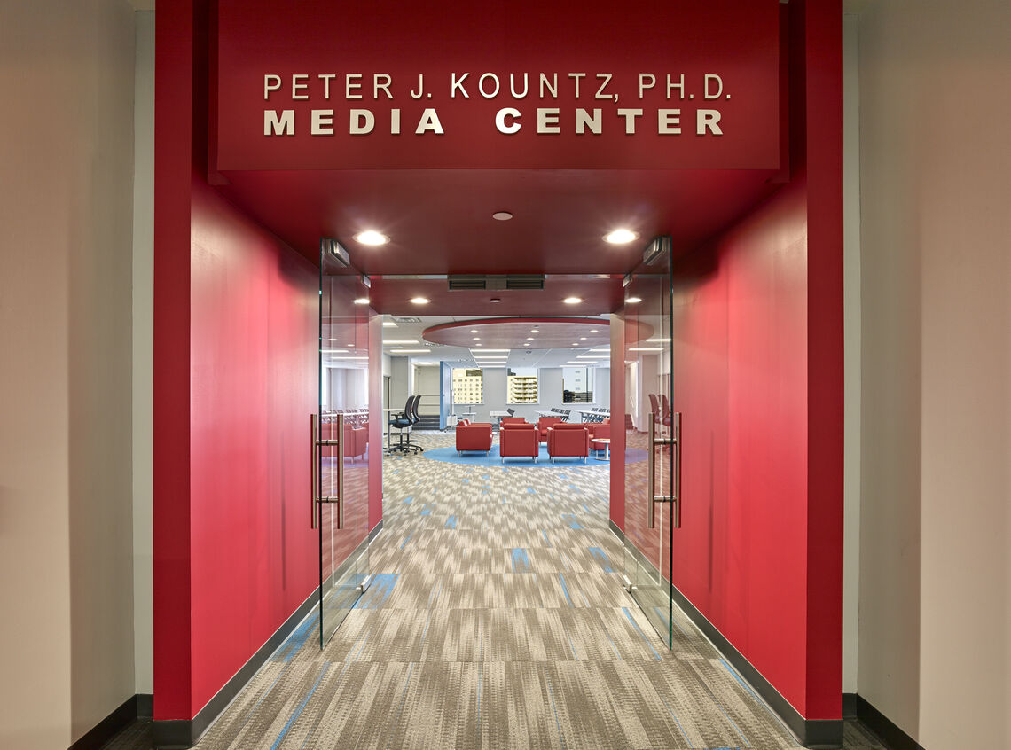 Renovation of existing library and conversion into state-of-the-art media center. Required demolition of existing finishes and installation of new entrance, drywall partitions, ceiling and soffits, acoustical ceiling, carpet and paint.  MEP changes included new lighting, fire alarm and sprinkler system, and minor mechanical upgrades.
