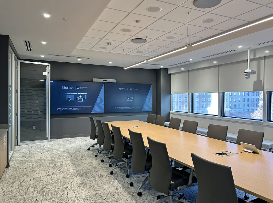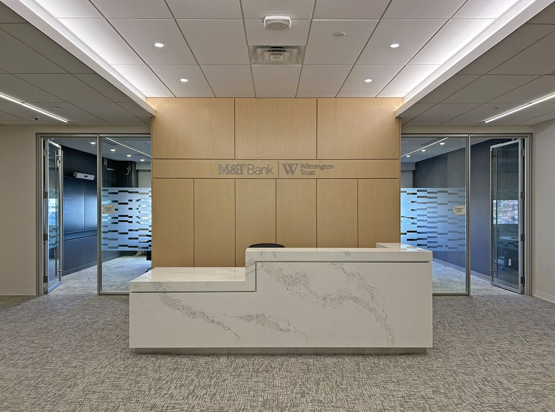 Clemens Construction completed a 21,045 SF full-gut renovation of M&T Bank’s Wilmington office on the 3rd floor of the Wilmington Trust 13-story office tower. The project transformed the existing floorplate into a modern, brand-aligned workplace through a complete interior fit-out that included all new MEP systems, modern lighting and controls, smart blinds, advanced AV infrastructure, new flooring, wall coverings, drop ceilings, extensive glass partitions, and FF&E selected to reflect M&T Bank’s corporate identity.