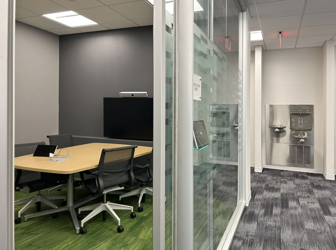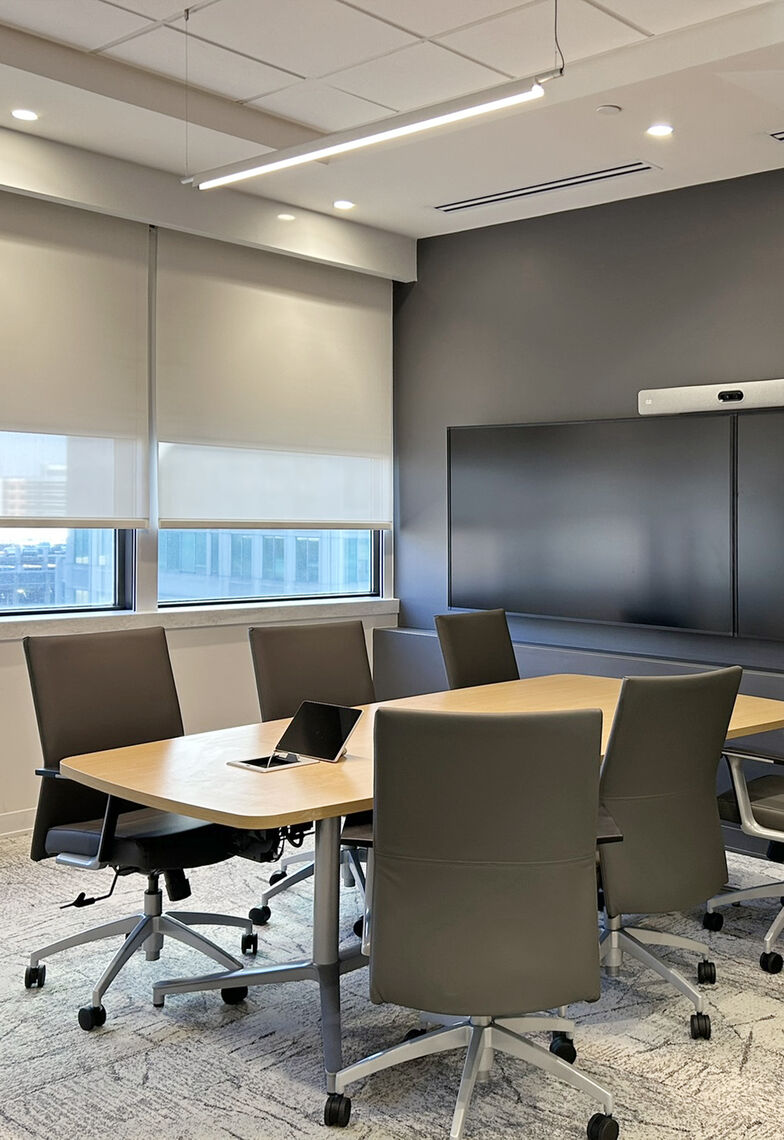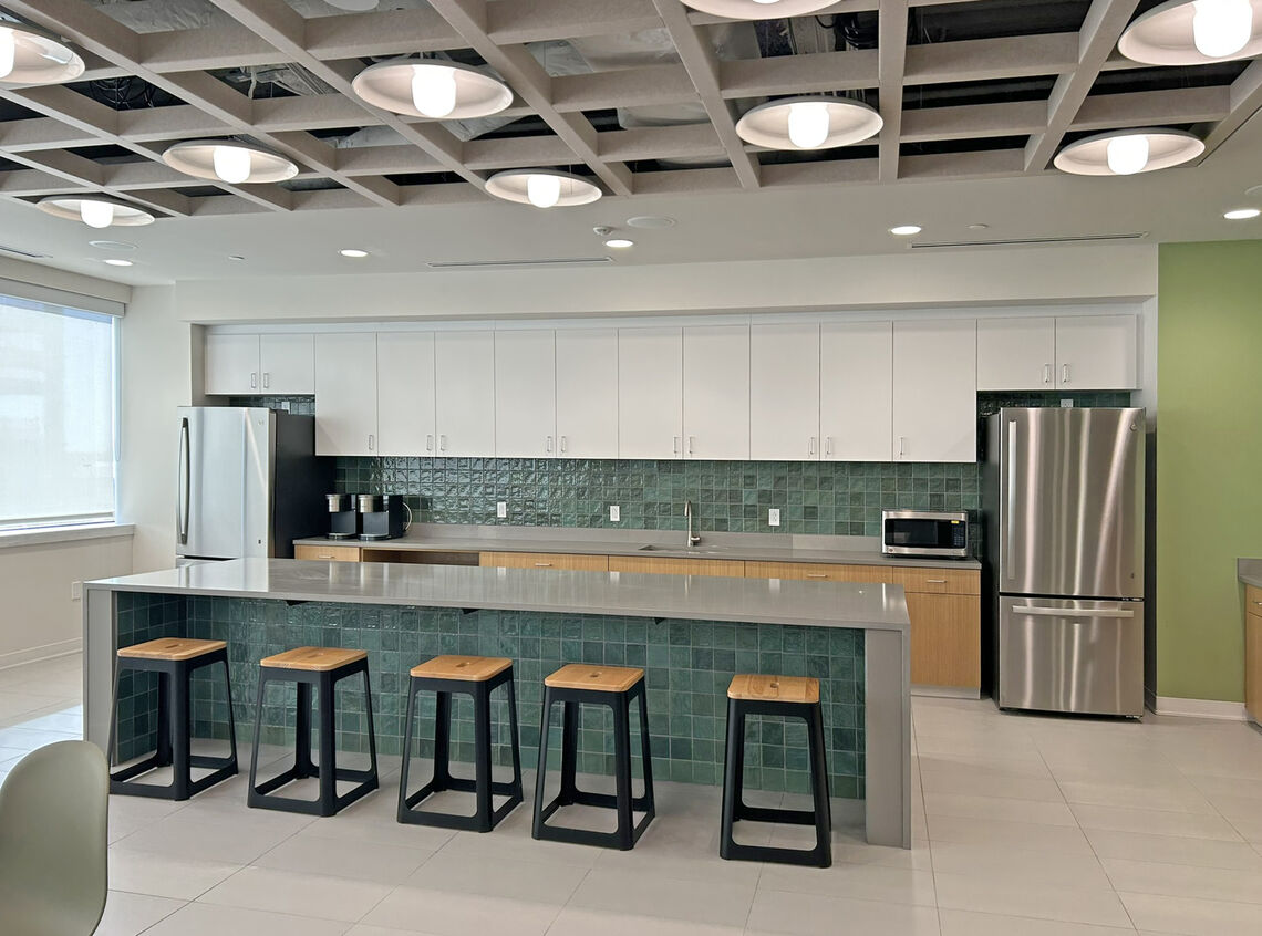 The renovated space features a welcoming elevator lobby and reception lounge anchored by a marble reception desk and custom millwork, along with a large communal café highlighted by a custom coffered ceiling and integrated lighting. Additional program elements include an auxiliary kitchenette, five conference rooms, two huddle rooms, three privacy rooms, 19 private offices, 58 open office workstations, a 1,500 SF assembly space, and both public and private restrooms. Clemens coordinated closely with the client, design team, and building management to deliver a high-quality, contemporary office environment within an active office tower, prioritizing quality, schedule, and seamless execution.