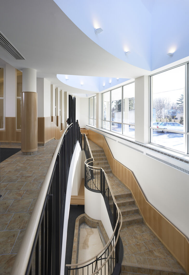 This 5,000 sf project needed to accomplish several objectives quickly in order to become operational for the upcoming Jewish High Holidays: the expansion and complete renovation of the sanctuary for its growing congregation, including new seating, windows, bima, upscale finishes and acoustical panels for better sound; the construction a two-story natural light-filled atrium to serve as a new entrance and lobby, the connection of the sanctuary and school buildings, and the addition of handicap-accessible restrooms, an elevator, administrative offices, and a lower level chapel with vaulted ceilings.
