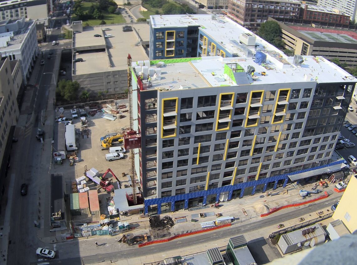 This 260,000 sf, 10-story overbuild of an existing, 1940s cast-in-place parking garage, required demolition of a floor and a half of the existing building. New steel columns run to a podium with a poured concrete deck that supported the existing structure as well as 10 stories of load-bearing wall panels with precast, hollow-core plank.
