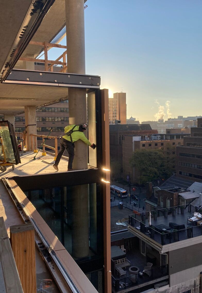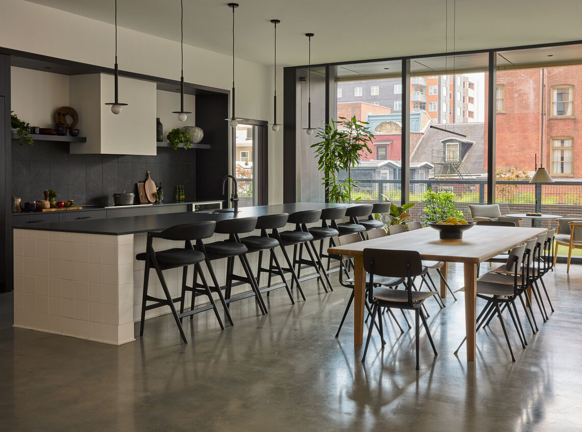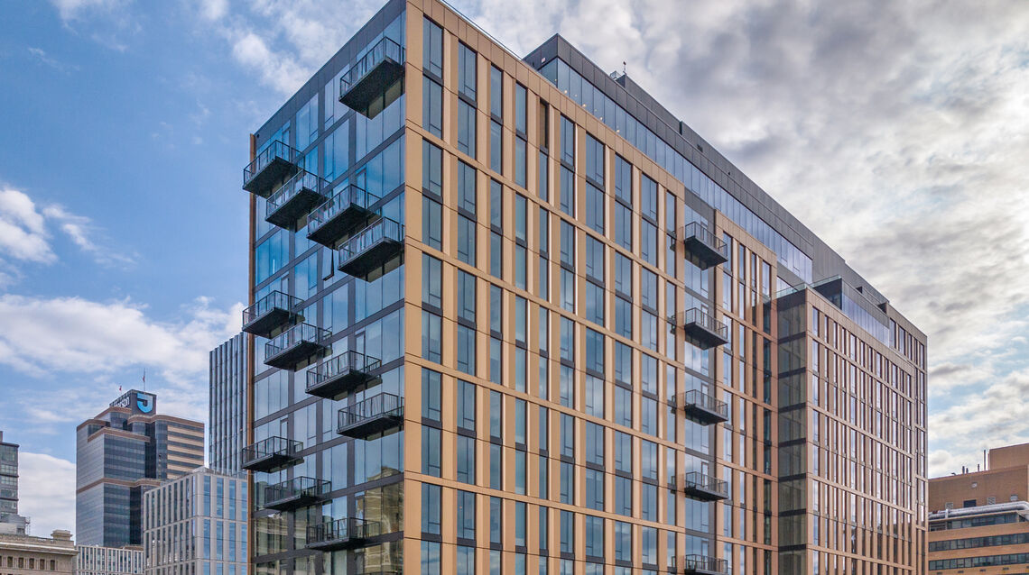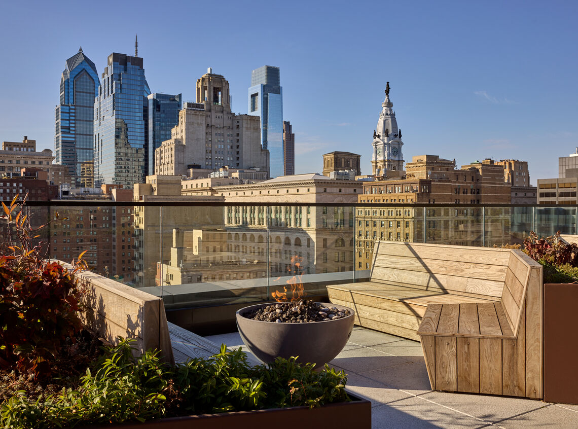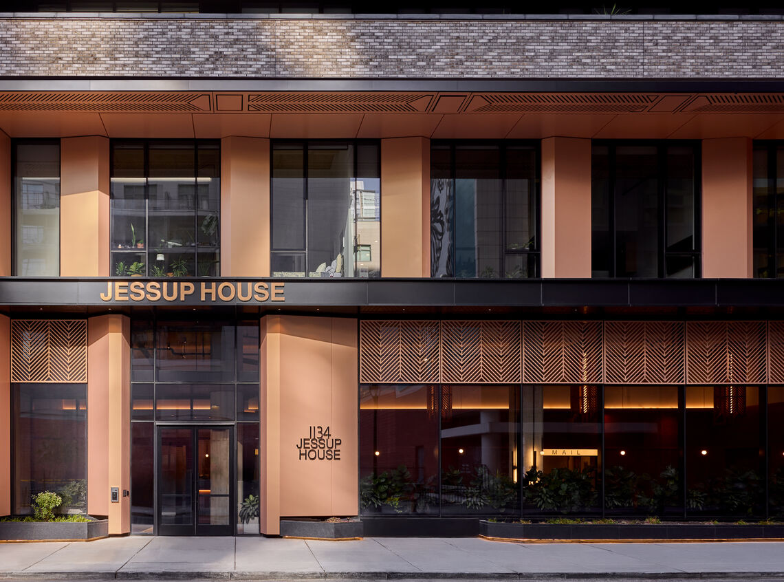 The Jessup House is a new 20-story, 371,000 SF mixed-use residential tower at 12th and Sansom, bordering Market East and Washington Square West. The building features 399 residential units, 11,000 SF of ground-floor commercial space, and below-grade parking. The concrete structure consists of a lower two-story podium clad in dark gray brick, with the upper set-back portion clad in a unitized window-wall system with balconies, undulating copper-colored metal panels, and full-height glazing. There is a large two-story amenity space on the 2nd and 3rd floors, including communal coworking space, breakout rooms, a fitness center, pool table, golf simulator, large kitchen/lounge, fireplace, an outdoor terrace, plunge pool, dog run, and pet spa. The 20th floor features several penthouse units, a clubroom, and a roof deck with incredible views of Center City.