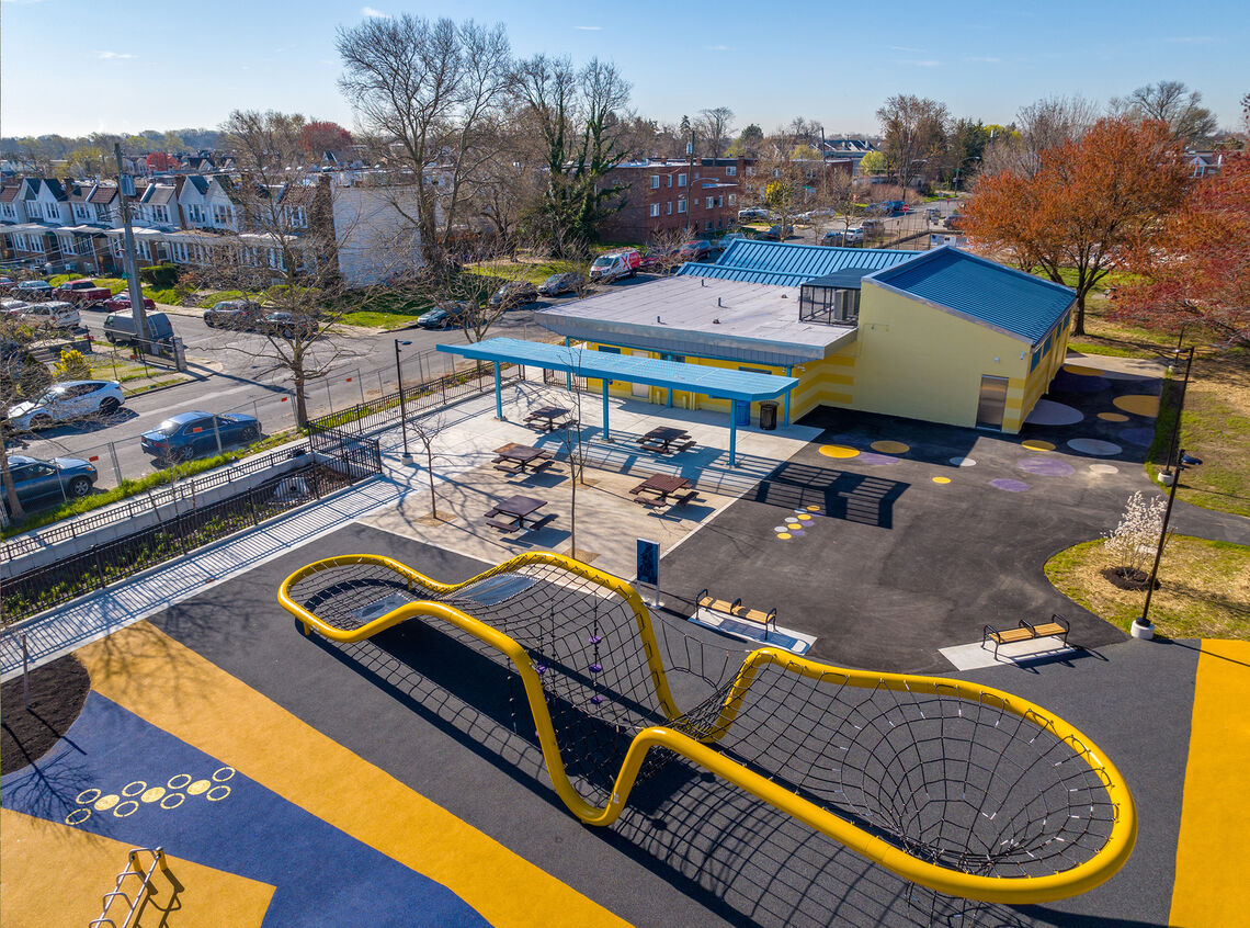 Clemens Construction, in collaboration with Rebuild PHL, revitalized Ziehler Playground, a 7.1-acre public park in Olney, North Philadelphia. This green space project included installing new stormwater management BMPs, modern playground equipment, safety surfaces, basketball courts, seating areas, shade structures, permeable patio/tree trench, landscaping, as well as replacing concrete and asphalt walkways. The 3,800 SF Recreation Center also underwent a comprehensive remodel encompassing new restrooms, cafeteria/event space, a boxing gym, security office, MEP upgrades, paint, and roof/awning restoration. Rebuild PHL aims to build cleaner, greener, stronger communities one park, rec center, and library at a time.